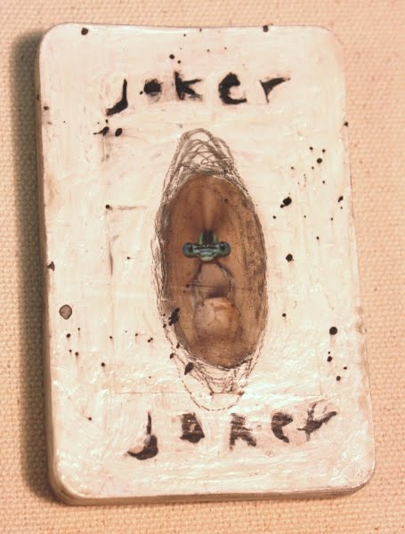 2010 hand painted joker playing card glued atop 10 other cards